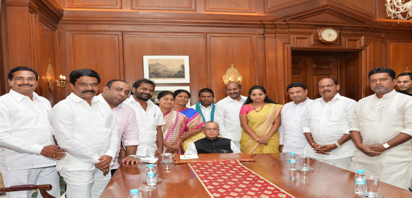 The President of India, Shri Pranab Mukherjee meeting with Ms. Kalvakuntla Kavitha, MP (LS) alongwith MLAs from Telangana, at Rashtrapati Bhavan, in New Delhi on August 30, 2015.