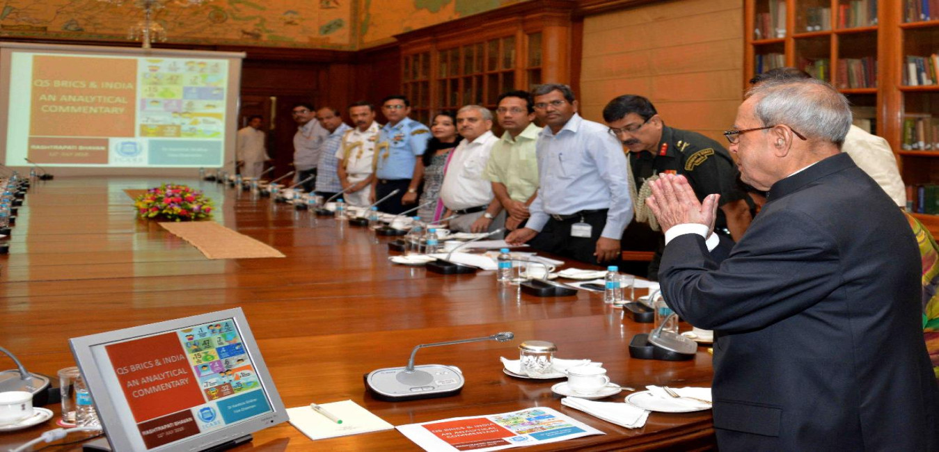 The President of India, Shri Pranab Mukherjee receiving the first copy of 'QS BRICS Universities Ranking 2015' from Shri TV Mohandas Pai, Chairman, Indian Centre for Academic Rankings and Excellence (ICARE) at Rashtrapati Bhavan , in New Delhi on July 11, 2015.
