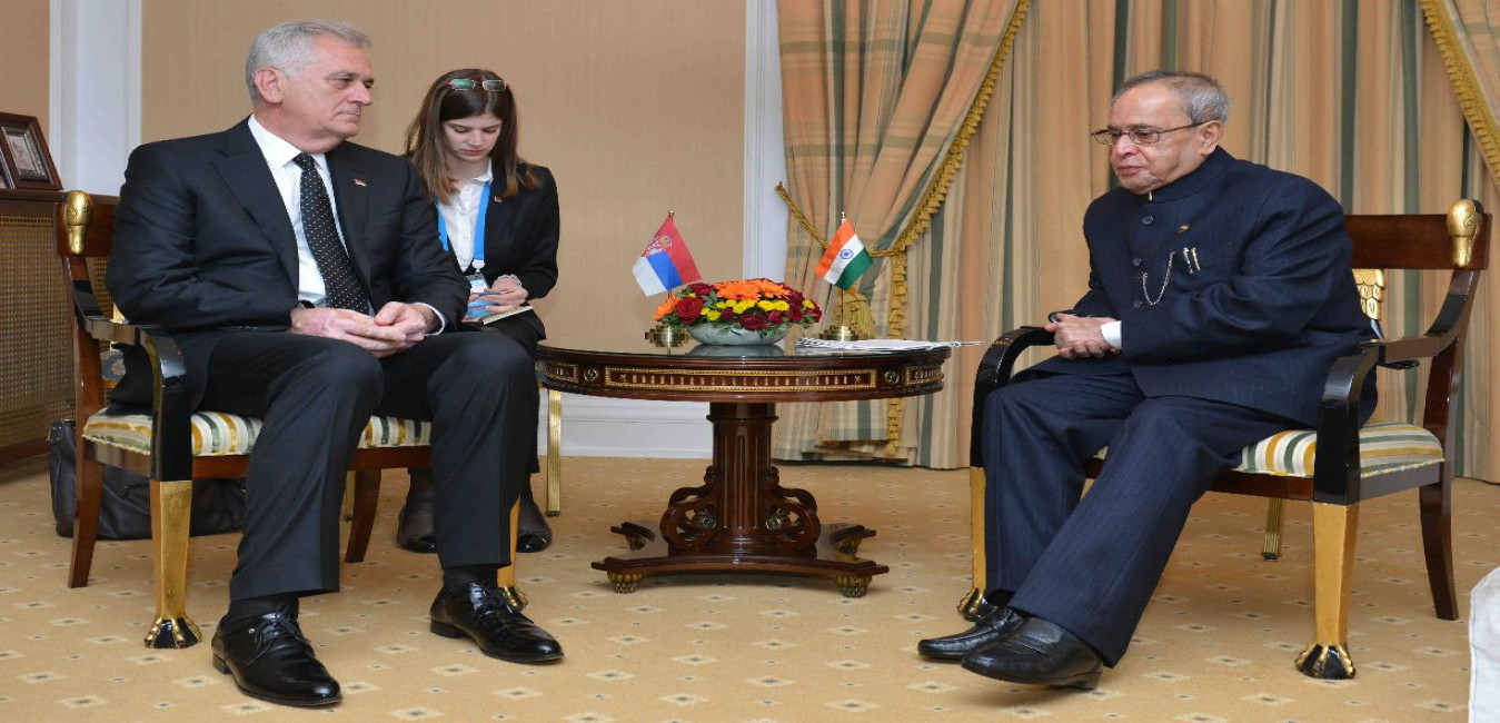 The President of Serbia, H.E. Mr. Tomislav Nikolic calling on the President of India, Shri Pranab Mukherjee, at the Hotel Ritz-Carlton, in Moscow, Russia on May 08, 2015.