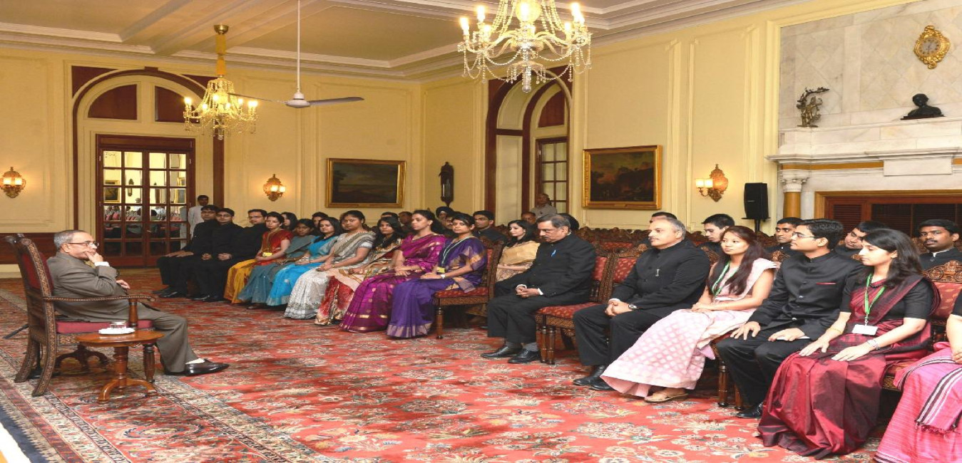 The President of India, Shri Pranab Mukherjee meeting with Officer Trainees of Indian Foreign Service (2012 Batch) from Foreign Service Institute (FSI) at Rashtrapati Bhavan in New Delhi on May 24, 2014