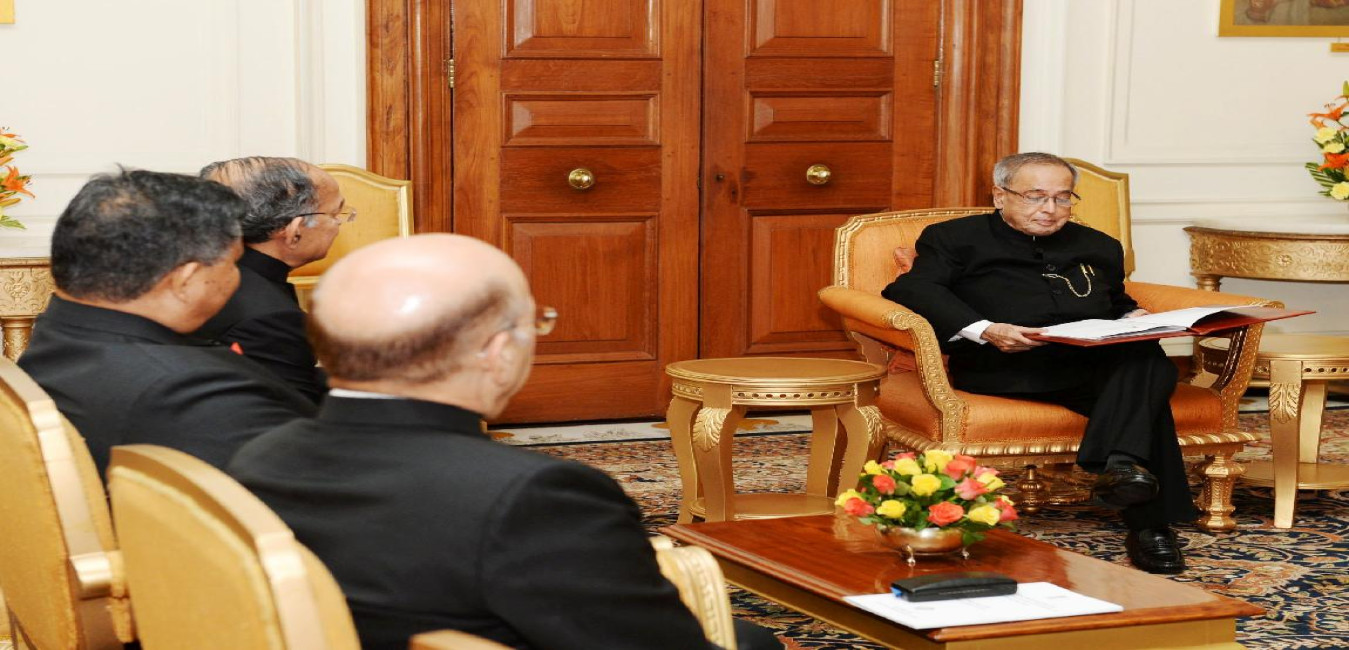 The Chief Election Commissioner of India, Shri V S Sampath, along with Election Commissioners, Shri H S Brahma and Dr Nasim Zaidi submitting the Report of 16th Lok Sabha Election, 2014 to the President of India, Shri Pranab Mukherjee at Rashtrapati Bhavan in New Delhi on May 18, 2014