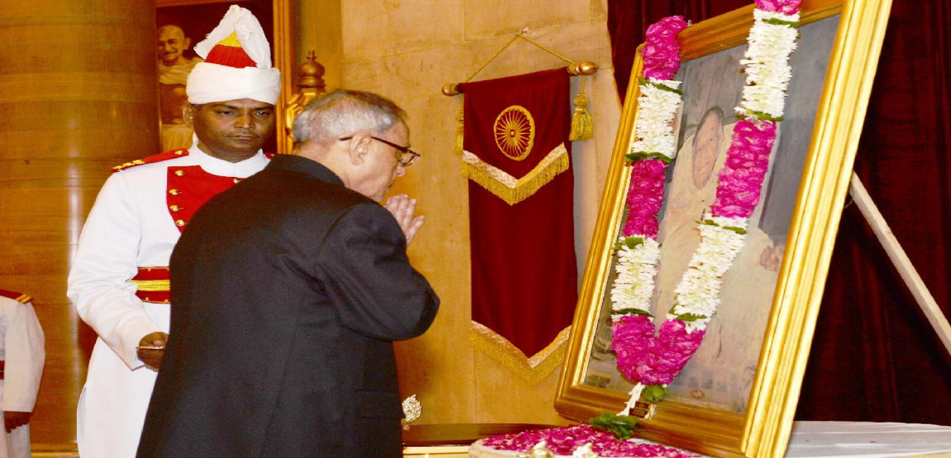 The President of India, Shri Pranab Mukherjee paying floral tributes to the Former President of India, Late Shri Giani Zail Singh on his Birth Anniversary at the Durbar Hall of Rashtrapati Bhavan in New Delhi on May 05, 2014