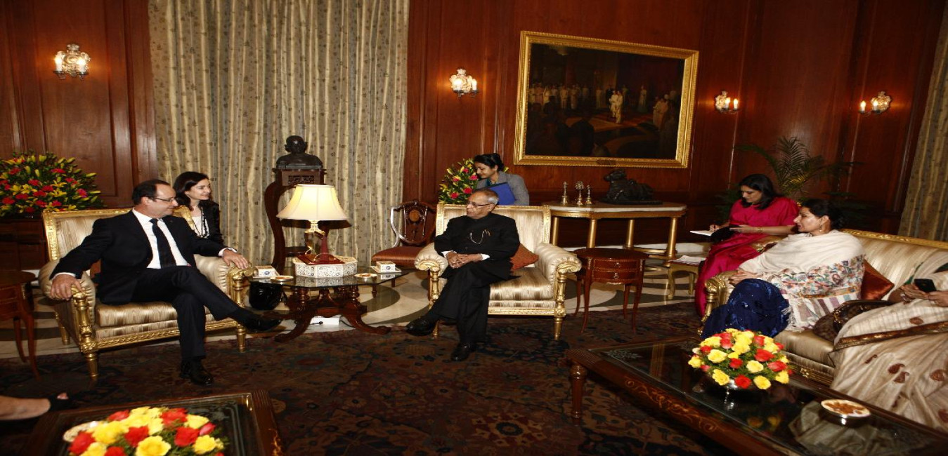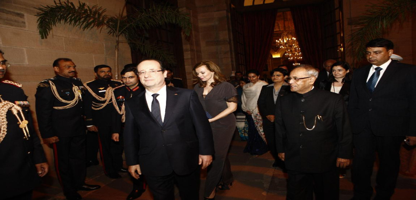 The President of India, Shri Pranab Mukherjee receives HE Mr Francois Hollande President of The Republic of France and Ms Valerie Trierweiler on February 14, 2013