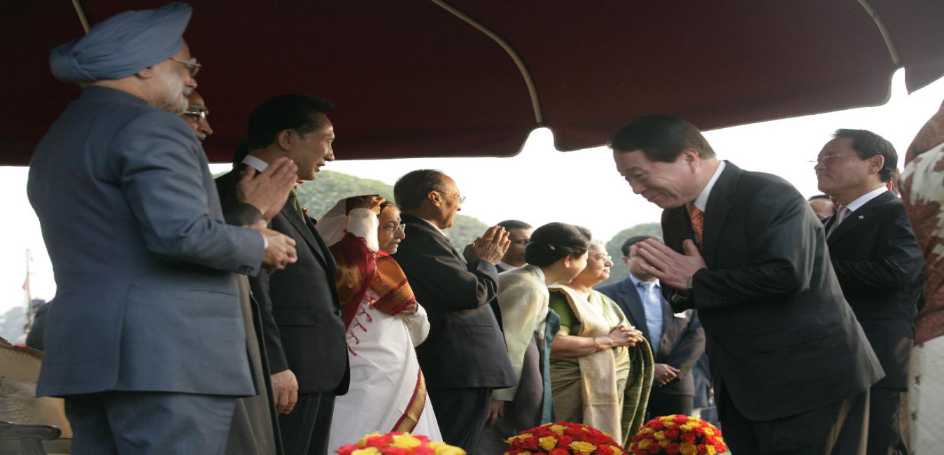 The President of India, Smt Pratibha Devisingh Patil at the Ceremonial Reception of the President of the Republic of Korea, HE Mr Lee Myung-Bak at the Forecourt of Rashtrapati Bhavan in New Delhi on Jan 25, 2010