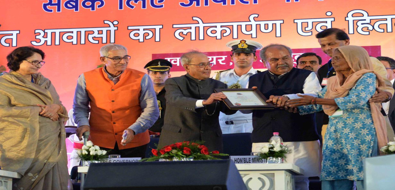The President of India, Shri Pranab Mukherjee distributing the keys and ownership certificates for EWS houses built under the Integrated Housing & Slum Development Project, at Jiwaji University, in Gwalior, Madhya Pradesh on October 03, 2016.