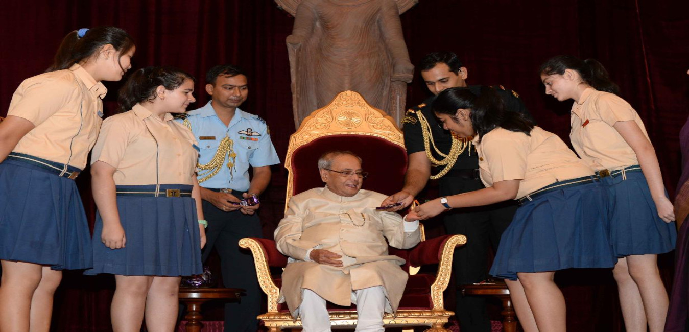 The President of India, Shri Pranab Mukherjee receiving Raksha Bandhan Greetings from the children/students from various schools/organizations at Rashtrapati Bhavan on August 18, 2016.