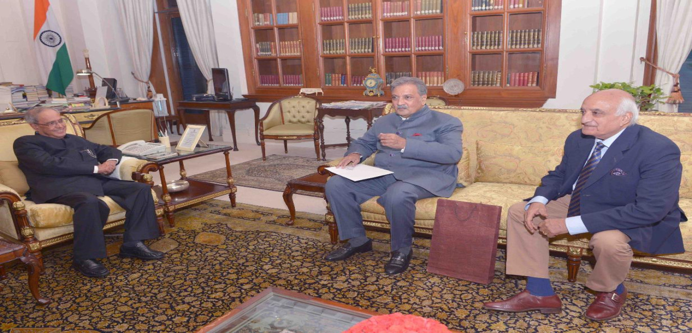 The President of India, Shri Pranab Mukherjee meeting with Maharaja Gaj Singh of Jodhpur, President & Shri Vijai Lal, Vice President, Indian Heritage Hotels Association, at Rashtrapati Bhavan on August 06, 2016.