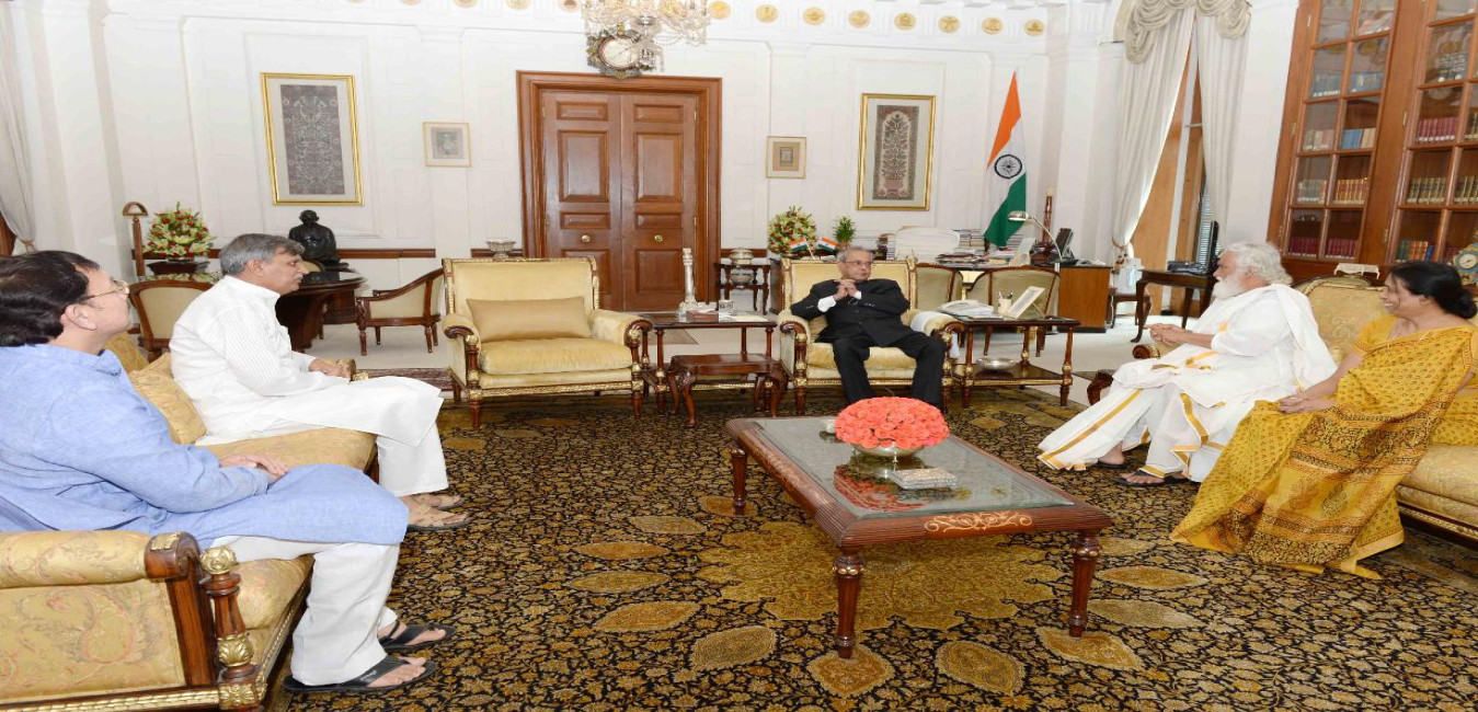 The President of India, Shri Pranab Mukherjee meeting with BS Sanyasi Maharaj, Secretary and others from Gaudiya Mission, Kolkata, at Rashtrapati Bhavan on July 19, 2016.