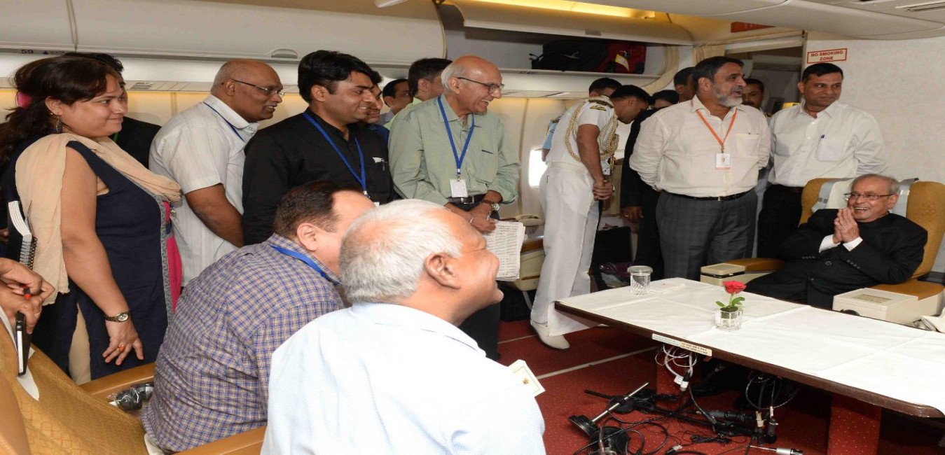 The President of India, Shri Pranab Mukherjee interacting with the accompanying officials and media delegation on board, Air India Special aircraft on his way to Ghana (Accra) on June 12, 2016.