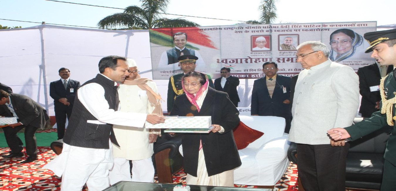 The President of India, Smt Pratibha Devisingh Patil hoisting the largest National Flag in India which is 207 feet high and the flag is 90 feet in length and 60 feet in width at Kurukshetra in Haryana on Feb 08, 2012