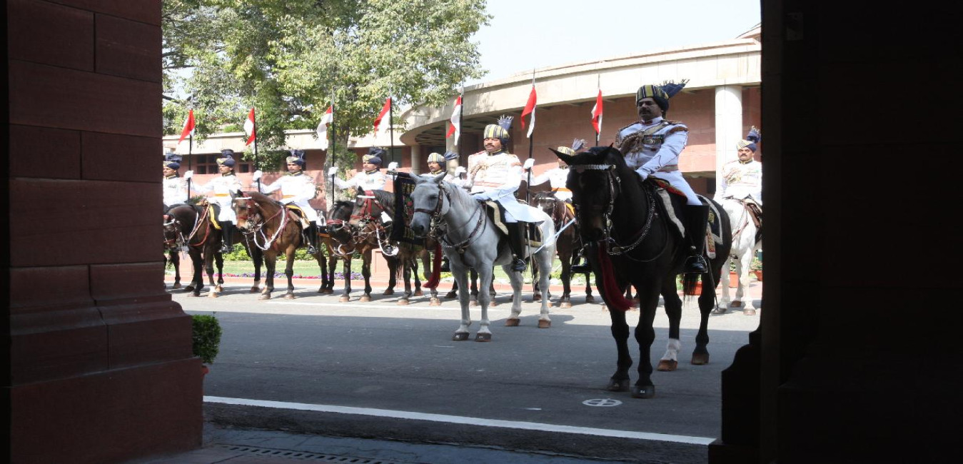 The President of India, Smt Pratibha Devisingh Patil walking in Procession towards the Central Hall of Parliament to deliver her address to both the Houses of Parliament at Parliament House in New Delhi on March 12, 2012