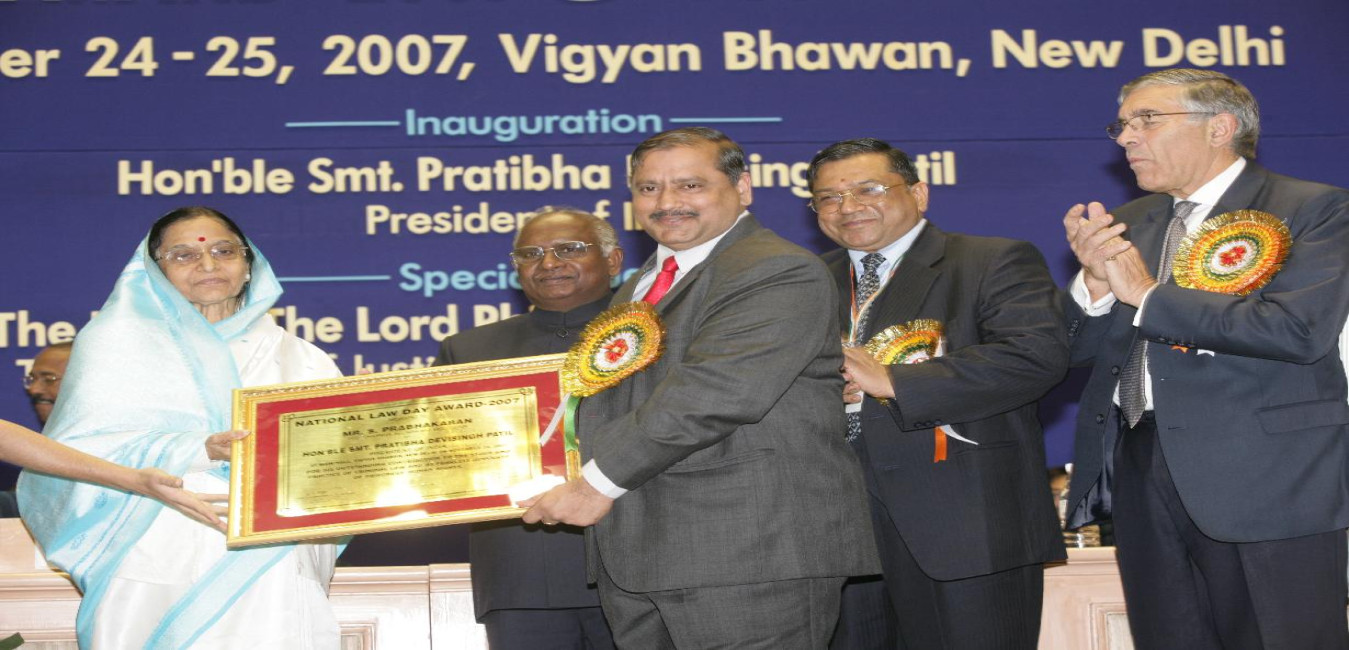 The President of India, Smt Pratibha Devisingh Patil presenting the International Jurist Award at Vigyan Bhavan in New Delhi on Nov 24, 2007