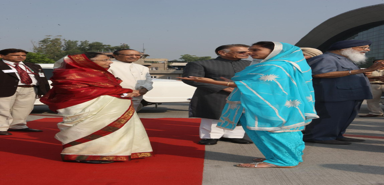 The President of India, Smt Pratibha Devisingh Patil being welcomed by the Governor of Punjab, Shri Shivraj Patil and Chief Minister of Punjab, Shri Parkash Singh Badal at Chandigarh Airport in Punjab on Oct 05, 2010