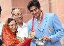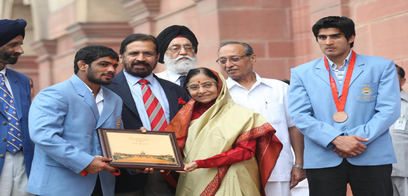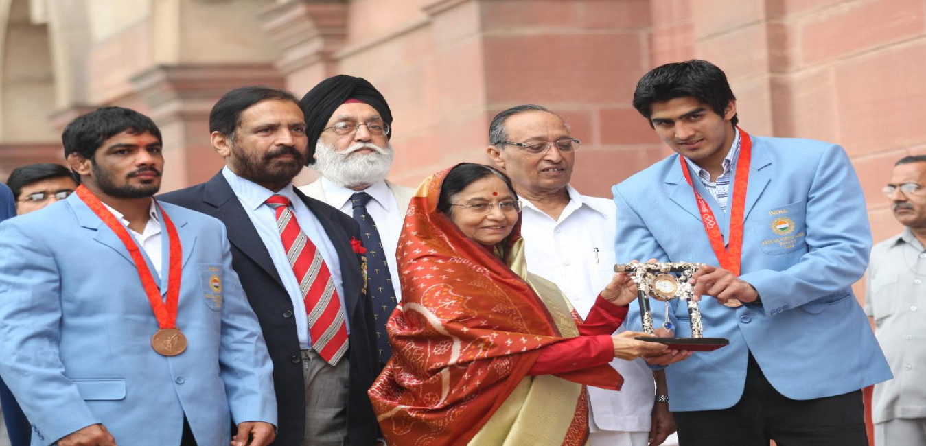 The President of India, Smt Pratibha Devisingh Patil with the Beijing Olympic Bronze Medal Winners, Wrestler Sushil Kumar and Boxer Vijender Kumar at Rashtrapati Bhavan in New Delhi on Aug 26, 2008