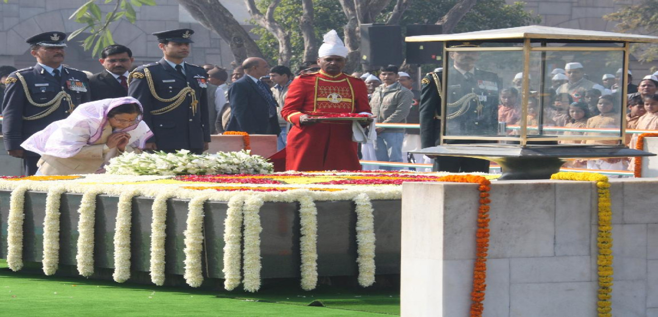 The President of India, Smt Pratibha Devisingh Patil paying homage at the Samadhi of the Father of the Nation, Mahatma Gandhi on the occasion of his 64th Death Anniversary at RajGhat in New Delhi on Jan 30, 2012