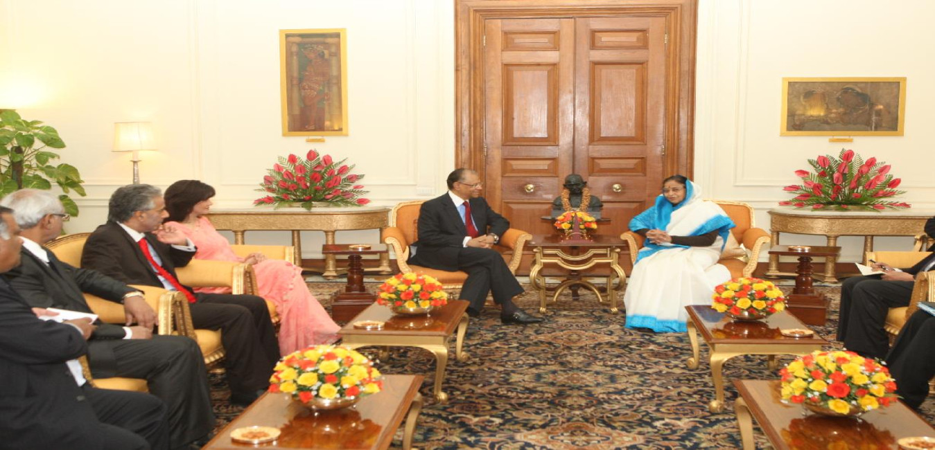 The Prime Minister of Mauritius, HE Dr Navinchandra Ramgoolam and his wife Mrs Veena Ramgoolam Calling on the President of India, Smt Pratibha Devisingh Patil at Rashtrapati Bhavan in New Delhi on Feb 07, 2012