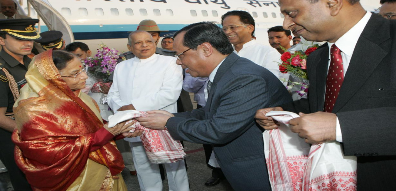 The President of India, Smt Pratibha Devisingh Patil being welcomed by the Governor of Assam, Shri Janaki Ballabh Patnaik at Guwahati in Assam on April 16, 2010