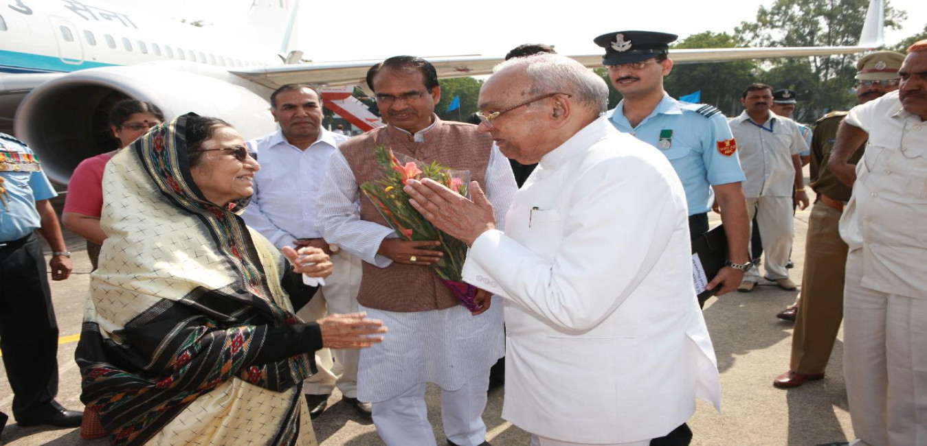 The President of India, Smt Pratibha Devisingh Patil being welcomed by the Governor of Madhya Pradesh, Shri Rameshwar Thakur and the Chief Minister of Madhya Pradesh, Shri Shivraj Singh Chauhan at Gwalior Airport in Madhya Pradesh on Nov 10, 2009