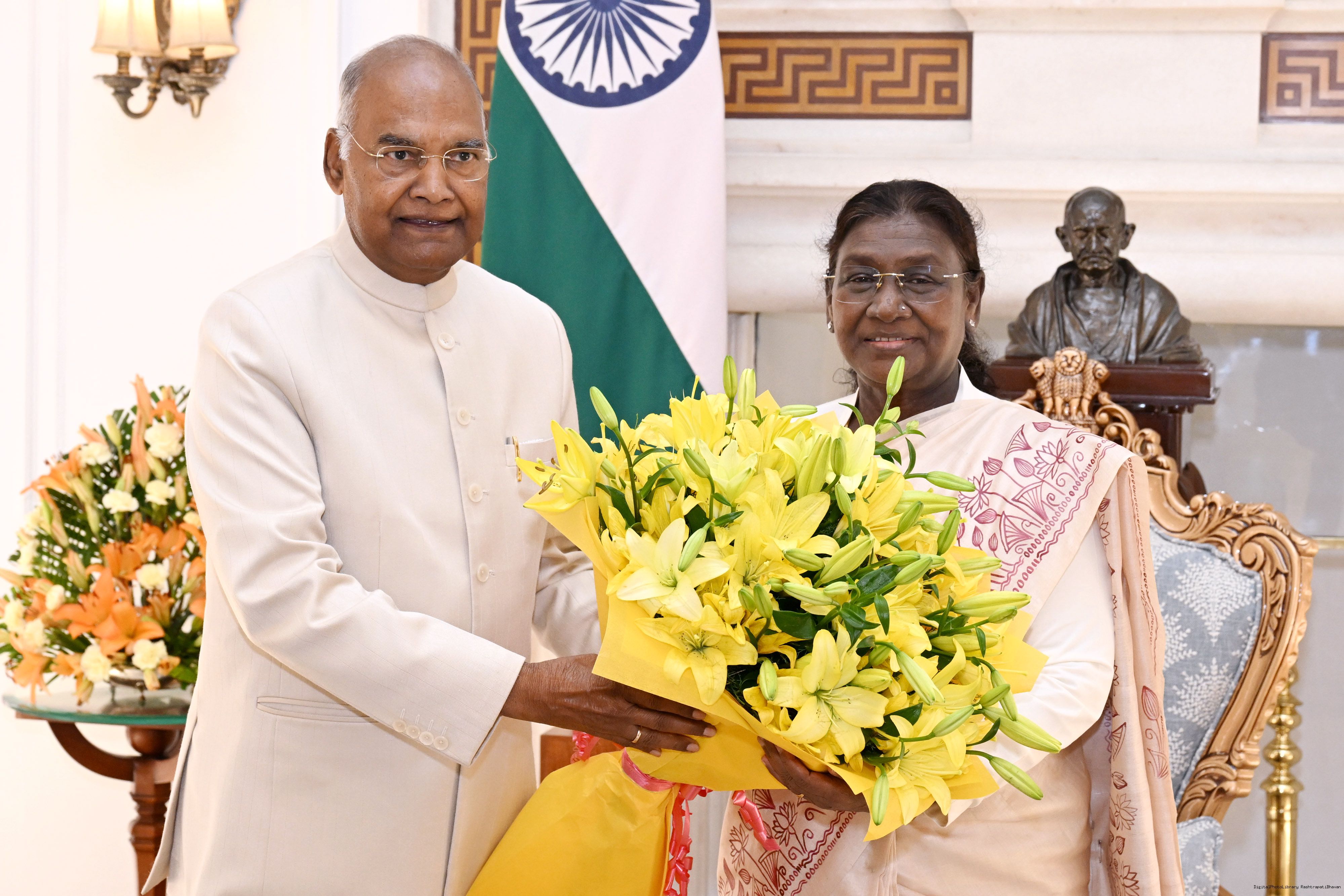 The President of India, Smt. Droupadi Murmu with former President of India, Shri Ram Nath Kovind after assumption of office as President of India, at Rashtrapati Bhavan on July 25, 2022.