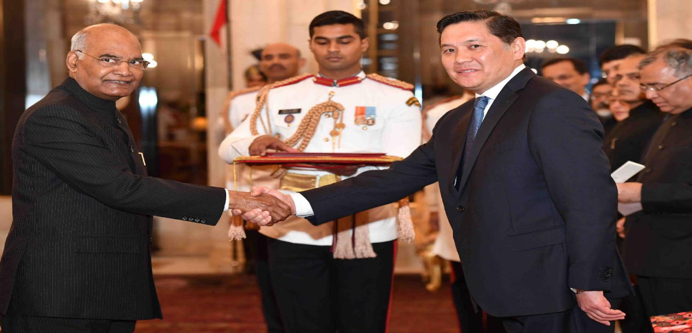 The Ambassador-designate of Kyrgyz Republic, H.E. Mr. Asein Isaev presenting his credentials to the President of India, Shri Ram Nath Kovind, at Rashtrapati Bhavan on March 13, 2019.