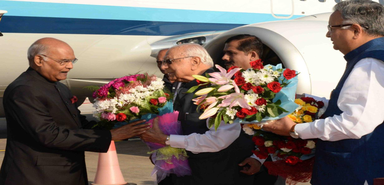 The President of India, Shri Ram Nath Kovind being received by the Governor of Chhattisgarh, Shri Balram Das Tandon and the Chief Minister of Chhattisgarh, Shri Raman Singh, on his arrival, at Raipur Airport, in Chhattisgarh on November 05, 2017.