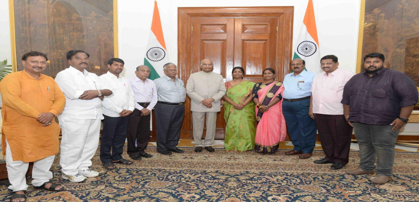Shri R. Bhupathi, Vice President, Akhil Bhartiya Koli Samaj (New Delhi) with others meeting with the President of India, Shri Ram Nath Kovind, at Rashtrapati Bhavan on July 01, 2019.