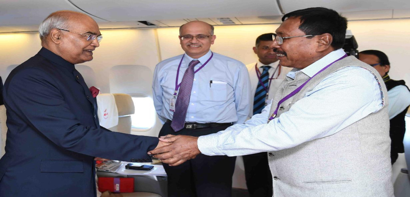 The President of India, Shri Ram Nath Kovind interacting with the official delegates Shri Rajen Gohain, Minister of State for Railways, Shri K. Bhabananda Singh, Member of Parliament (Rajya Sabha), Shri Ram Prasad Sarmah, Member of Parliament (Lok Sabha) on his way to Nay Pyi Taw, The Republic of The Union of Myanmar, at Air India Special aircraft on December 10, 2018.