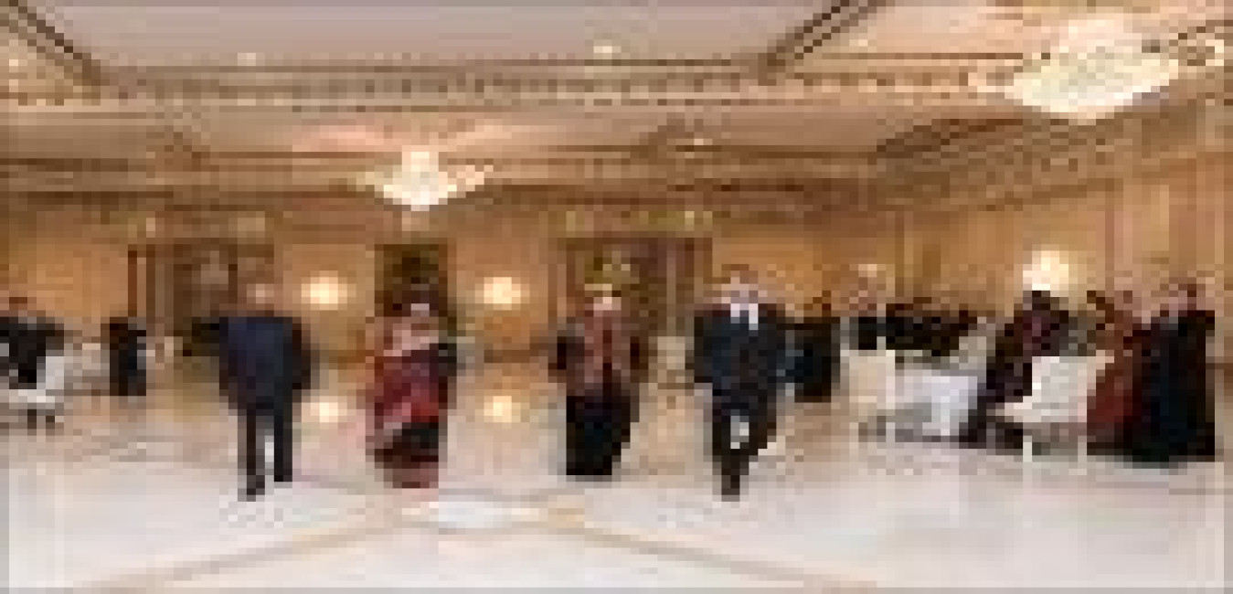 The President of India, Shri Ram Nath Kovind attended a banquet with musical evening hosted by the President of Turkmenistan, Mr. Serdar Berdimuhamedov, at Oguzhan Presidential Palace, in Ashgabat, Turkmenistan on April 02, 2022.