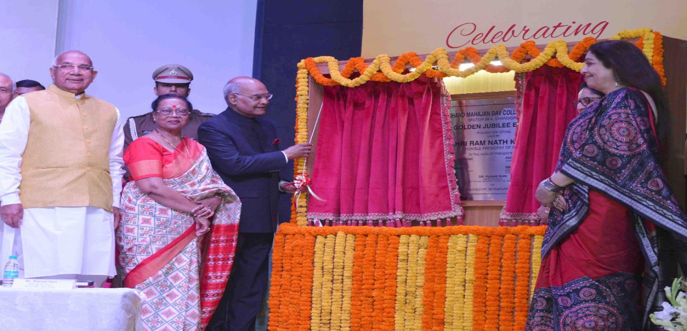 The President of India, Shri Ram Nath Kovind laying the foundation stone of Golden Jubilee Block, at the Golden Jubilee Celebrations of Mehr Chand Mahajan DAV College for Women, in Chandigarh on February 28, 2018.