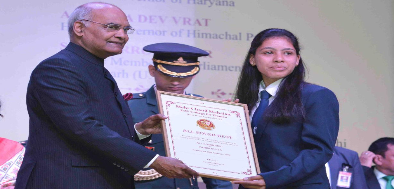 The President of India, Shri Ram Nath Kovind attending the Golden Jubilee Celebration of Mehr Chand Mahajan DAV College for Women and presenting Award of Certificate to the International level players of the MCM DAV College, in Chandigarh on February 28, 2018.