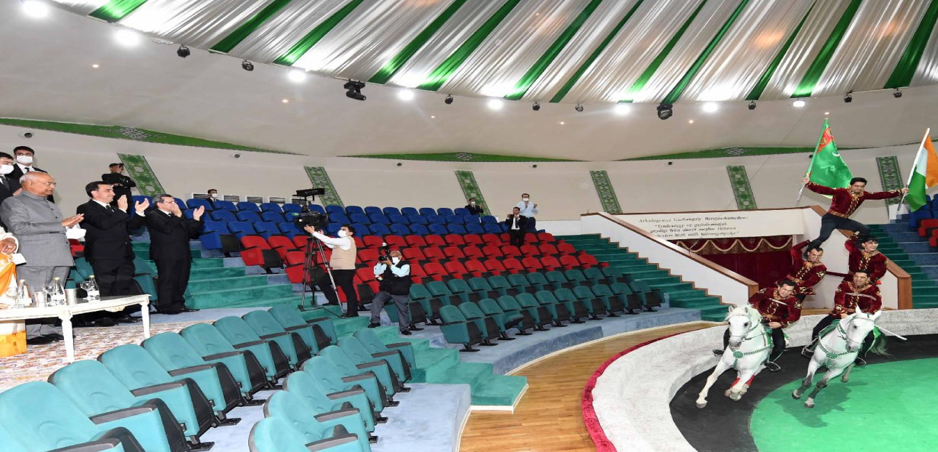The President of India, Shri Ram Nath Kovind witnessed a horse show at the International Akhal-Teke Equestrian Complex, in Ashgabat, Turkmenistan on April 03, 2022.