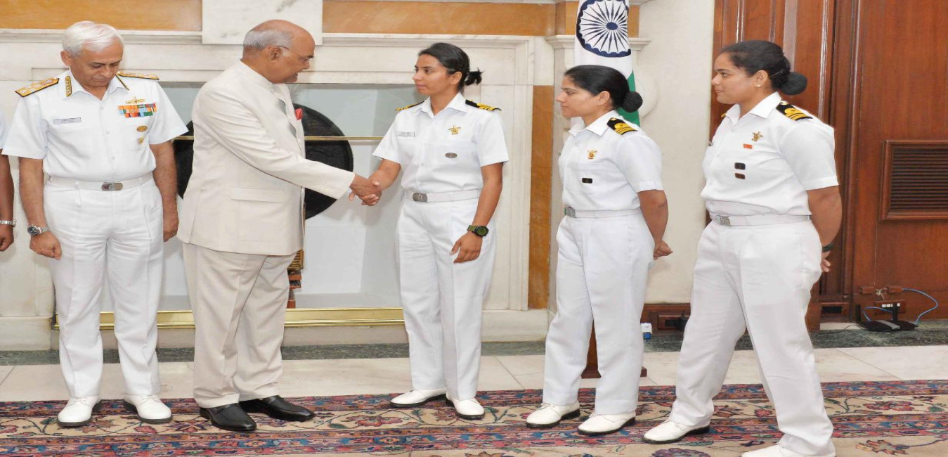 The President of India, Shri Ram Nath Kovind interacting with the all-women crew of INSV Tarini on completion of their voyage of circumnavigation of the globe, at Rashtrapati Bhavan on June 01, 2018.