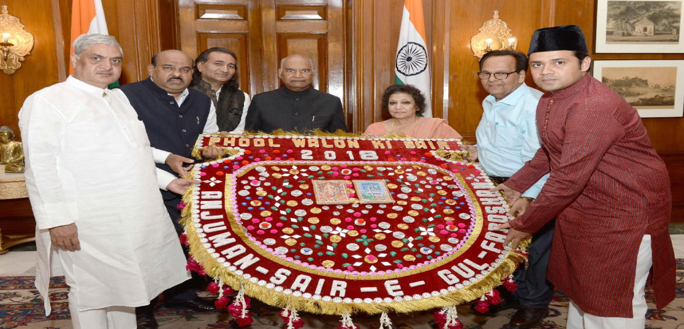 Smt. Usha Kumar, General Secretary, Anjuman Sair-e-Gul Faroshan with others presenting a Pankha of Phool Waalon Ki Sair to the President of India, Shri Ram Nath Kovind, at Rashtrapati Bhavan on November 02, 2018.