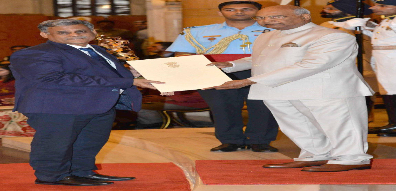 The Ambassador-designate of the Kingdom of Netherlands, H.E. Mr. Marten van den Berg presenting his credentials to the President of India, Shri Ram Nath Kovind, at Rashtrapati Bhavan on September 20, 2018.