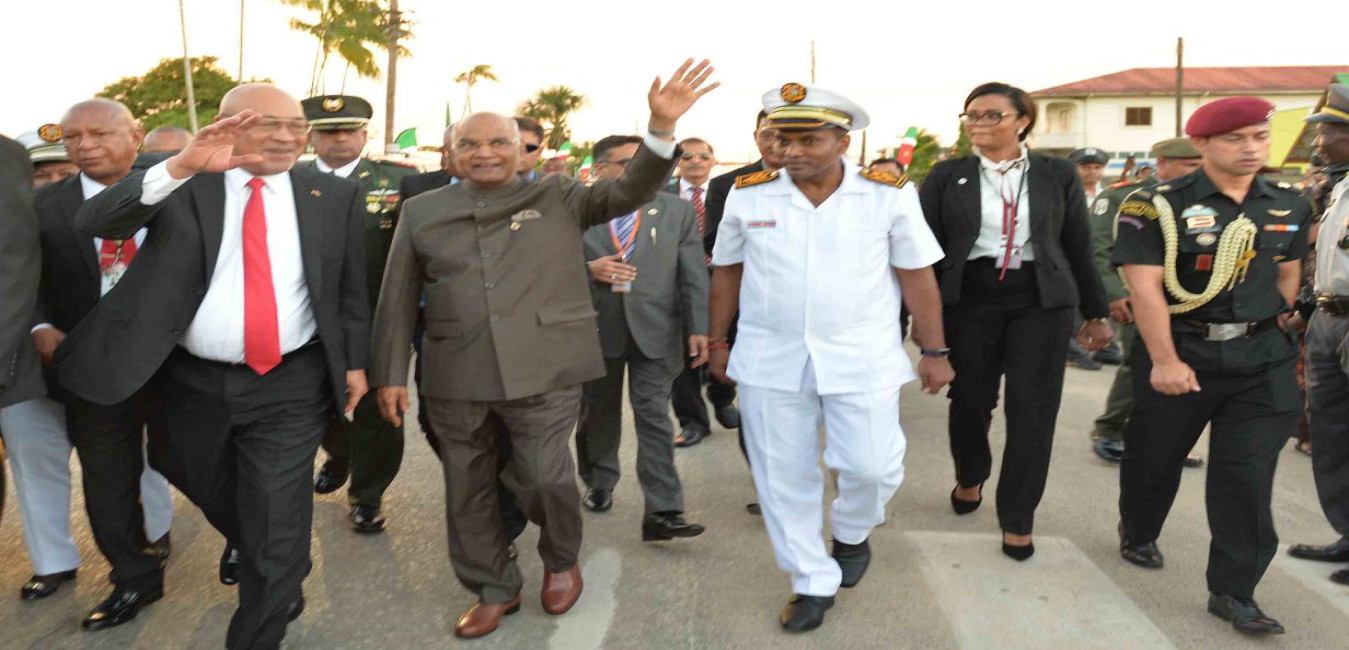 The President of India, Shri Ram Nath Kovind and the First Lady of India, Smt. Savita Kovind being received by the President of the Republic of Suriname, H.E. Mr. Desire Delano Bouterse and the First Lady of Suriname, Mrs. Ingrid Bouterse-Waldring, during the Ceremonial arrival, at Johan Adolf Pengel International Airport, Paramaribo, in Suriname on June 19, 2018.