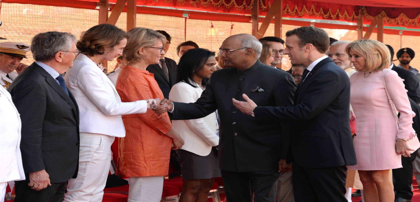 The President of India, Shri Ram Nath Kovind receiving the President of the French Republic, H.E. Mr. Emmanuel Macron and Mrs. Brigitte Macron during their Ceremonial Reception, at Forecourt, in Rashtrapati Bhavan on March 10, 2018.