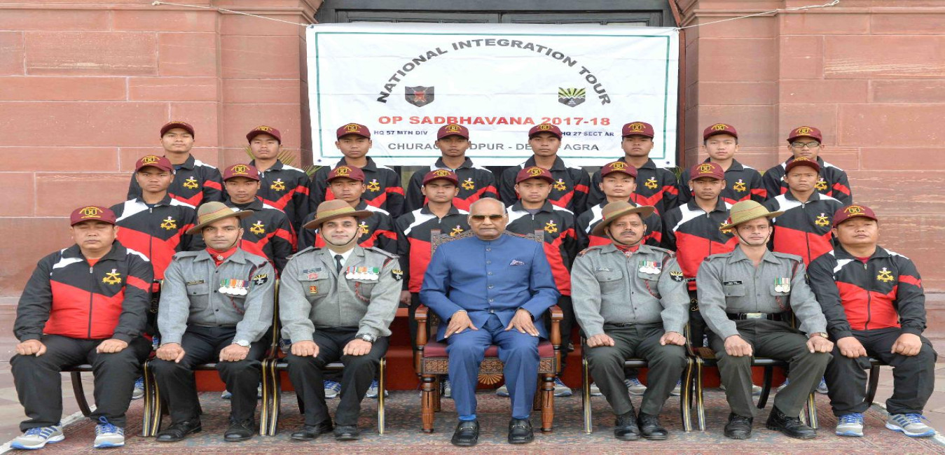 Students and teachers from Churachandpur attending National Integration Tour, organised by the 25 AR/57 Mtn Div/3 Corps of Eastern Command meeting with the President of India, Shri Ram Nath Kovind, at Rashtrapati Bhavan on February 10, 2018.