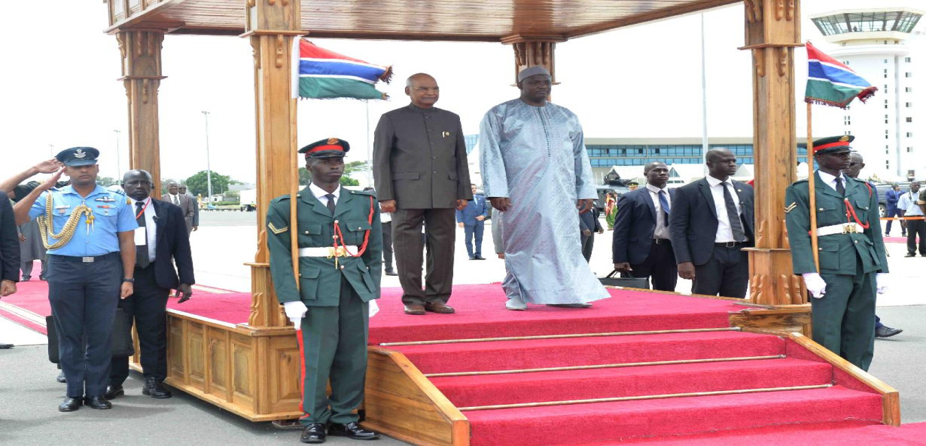 The President of India, Shri Ram Nath Kovind accorded a ceremonial welcome by the President of The Gambia, H.E. Mr. Adama Barrow, at Banjul Airport, The Gambia on July 30, 2019.