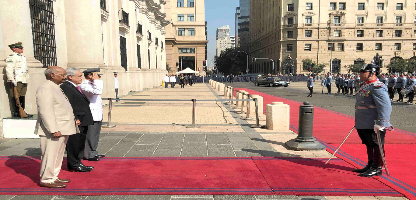The President of India, Shri Ram Nath Kovind accorded a Ceremonial Welcome by the President of Chile, H.E. Mr. Sebastian Pinera, at 'La Moneda' Presidential Palace, Santiago, in the Republic of Chile on April 01, 2019.