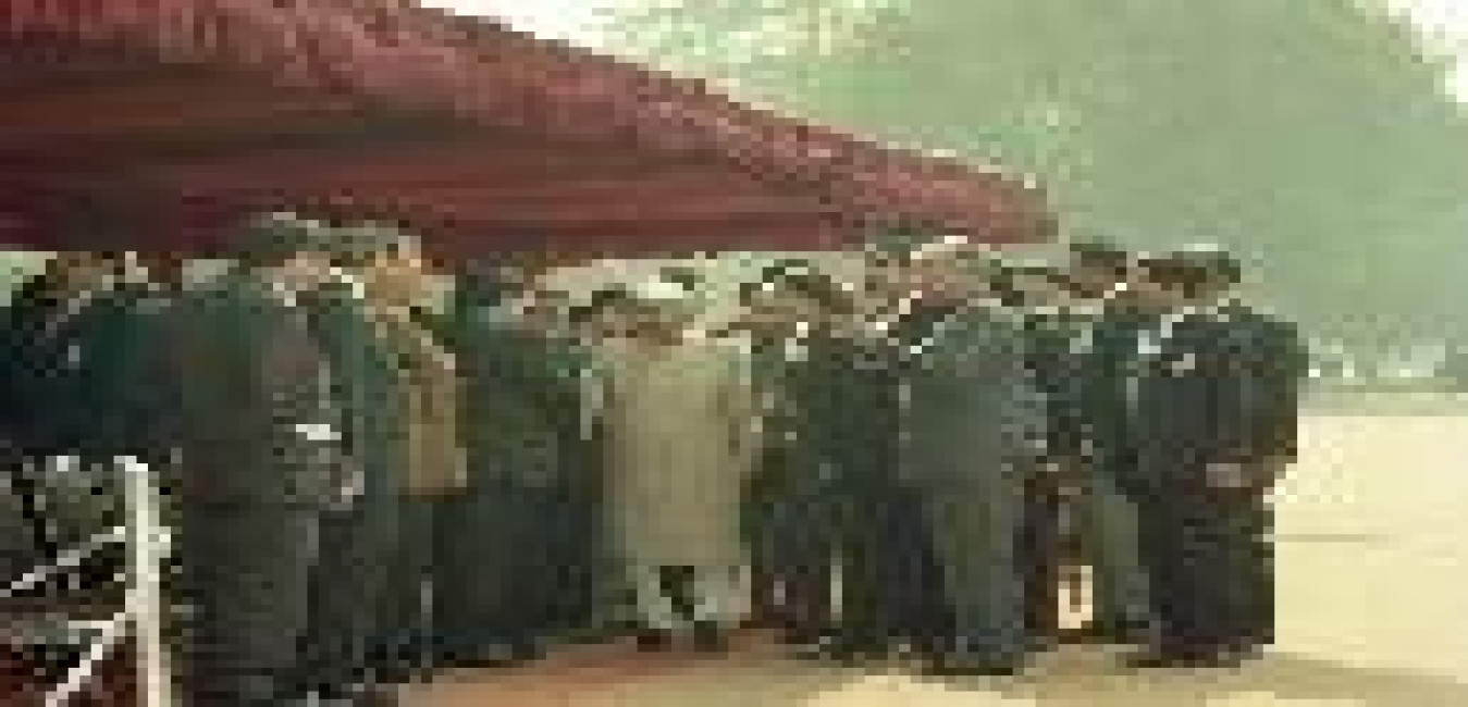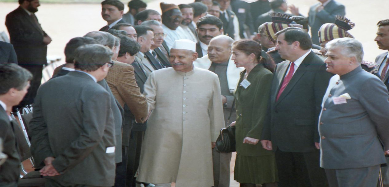 The President of India, Dr. Shankar Dayal Sharma receiving H.E. Mr. Emomali Sharipovich Rakhmonov, President of the Republic of Tajikistan, at the Ceremonial Reception, at Rashtrapati Bhavan in New Delhi on December 11, 1995.