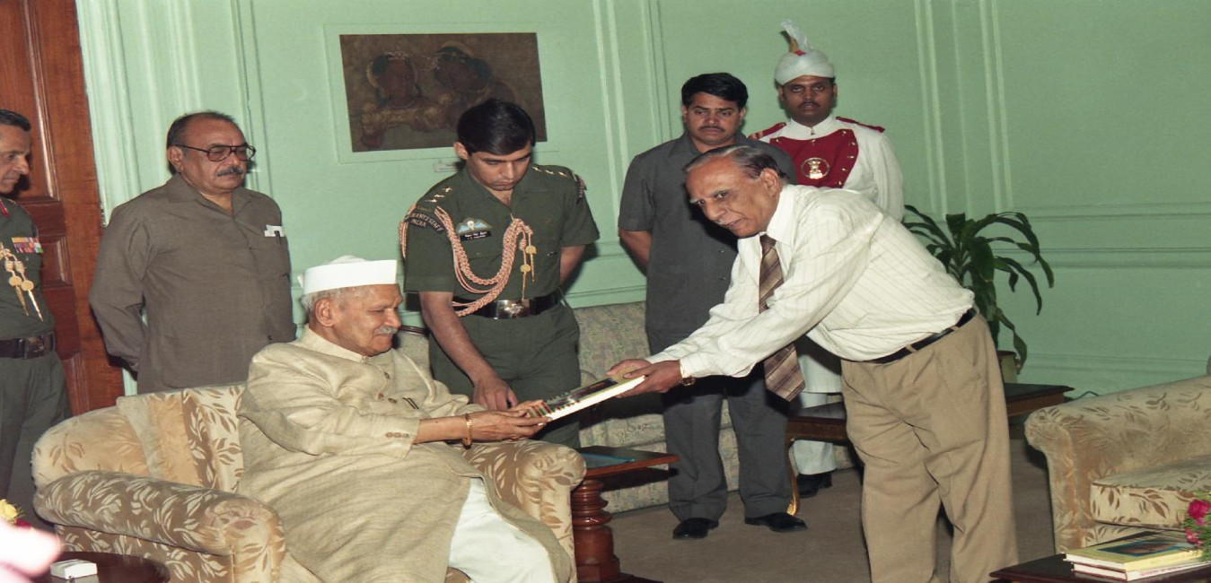 The President of India, Dr. Shankar Dayal Sharma receiving a copy of Book "Rajiv Gandhi Human Facet" from Shri Harish Chander at Rashtrapati Bhavan in New Delhi on May 14, 1997