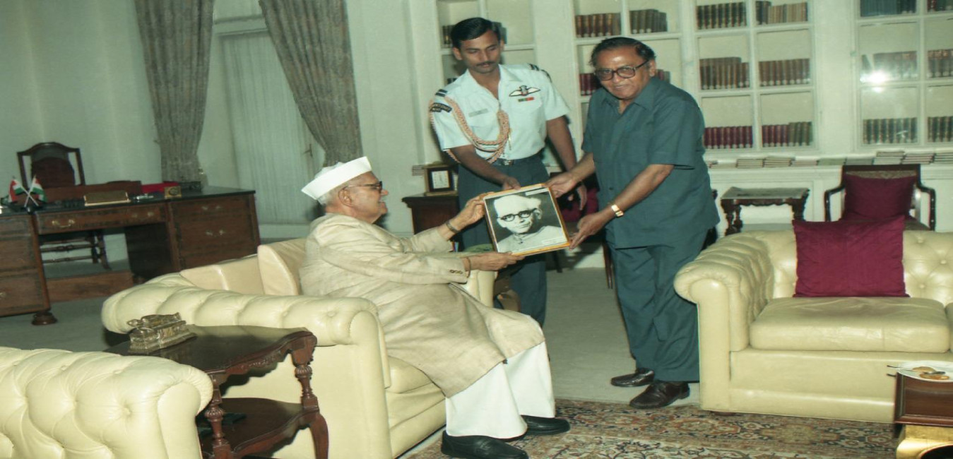 The President of India, Dr. Shankar Dayal Sharma meeting with Shri Lakshmi Narayan with others at Rashtrapati Bhavan in New Delhi on February 12, 1997.