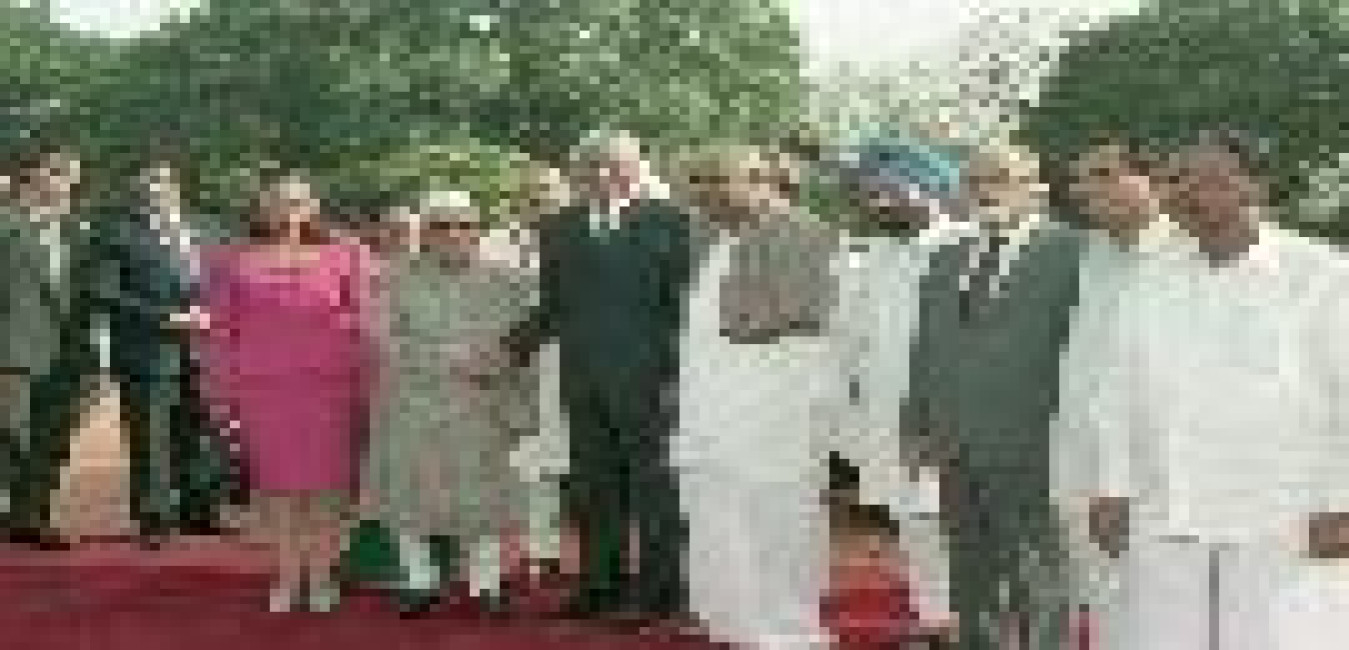 The President of India, Dr. Shankar Dayal Sharma receiving the President of the Republic of South Africa, H.E. Dr. Nelson R. Mandela and H.R.H. Princess Zenani Mandela-Dlamini at their Ceremonial Reception, at Rashtrapati Bhavan in New Delhi on March 27, 1997.