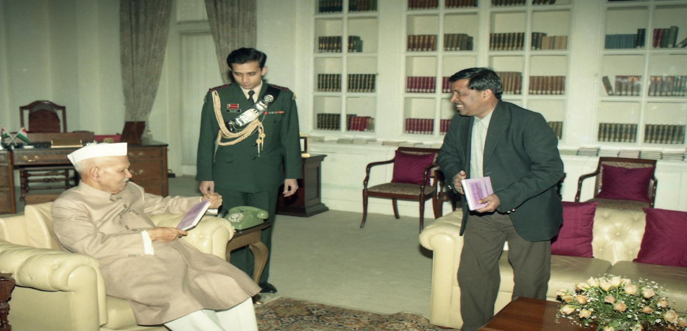 The President of India, Dr. Shankar Dayal Sharma receiving a copy of the book from Dr. Raveendra Kapur at Rashtrapati Bhavan in New Delhi on February 18, 1997.