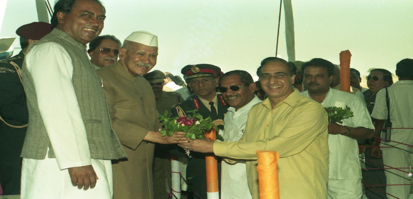 The President of India, Dr. Shankar Dayal Sharma unveiling the Statue of Netaji Subhash Chandra Bose at Bhopal on February 28, 1997. Smt. Vimala Sharma, the Governor, Madhya Pradesh, Mohammad Shafi Qureshi and Chief Minister, Madhya Pradesh, Shri Digvijaya Singh are also seen.