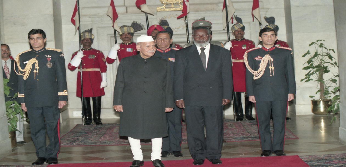 The President of India, Dr. Shankar Dayal Sharma receiving the President of the Republic of Namibia, HE Dr. Sam Nujoma at the Ceremonial Reception, at Rashtrapati Bhavan in New Delhi on February 14, 1997.