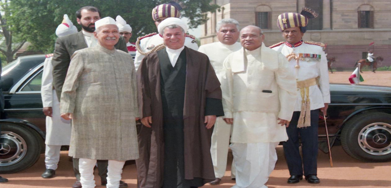 The President of India, Dr. Shankar Dayal Sharma receiving the President of Islamic Republic of Iran, H.E. Mr. Akbar Hashemi Rafsanjani at the Ceremonial Reception, at Rashtrapati Bhavan in New Delhi on April 17, 1995.