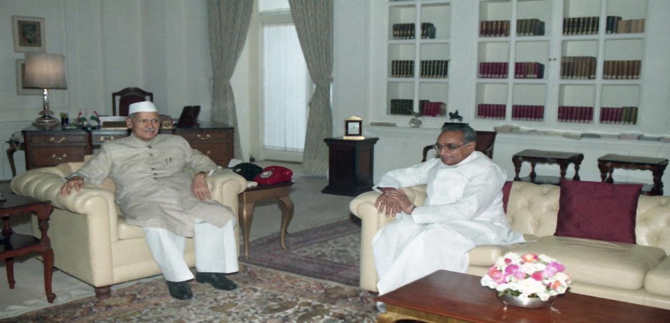 The President of India, Dr. Shankar Dayal Sharma meeting with Shri Bhajan Lal, Chief Minister of Haryana at Rashtrapati Bhavan in New Delhi on April 02, 1994.