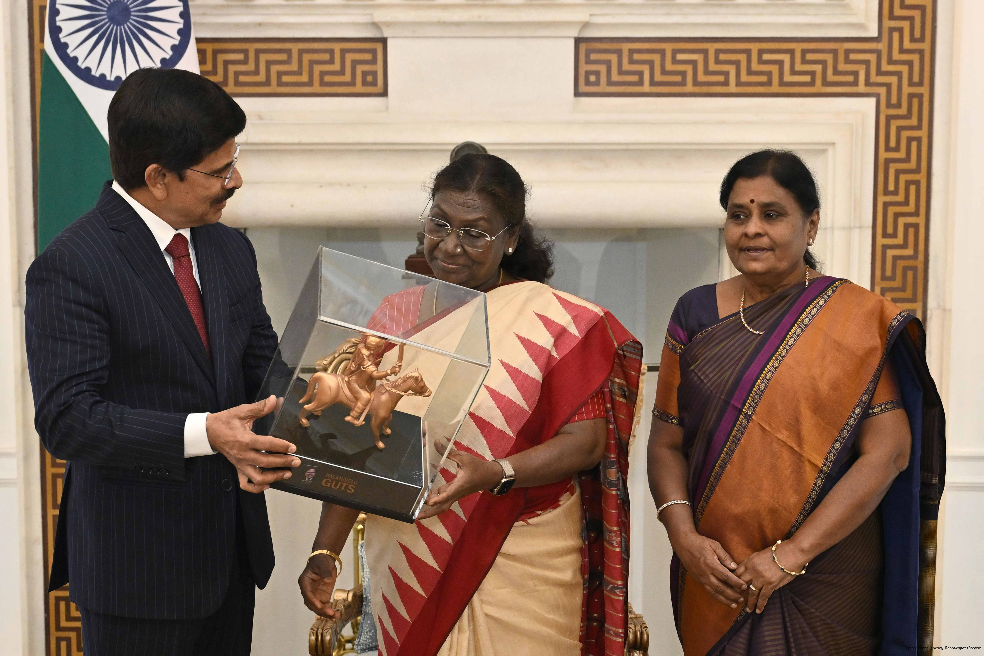 Dr. L Murugan, MoS for Information Boradcasting and Parliamentary Affairs and Shri Sampath and others meeting with the President of India, Smt. Droupadi Murmu at Rashtrapati Bhavan on October 17, 2025.