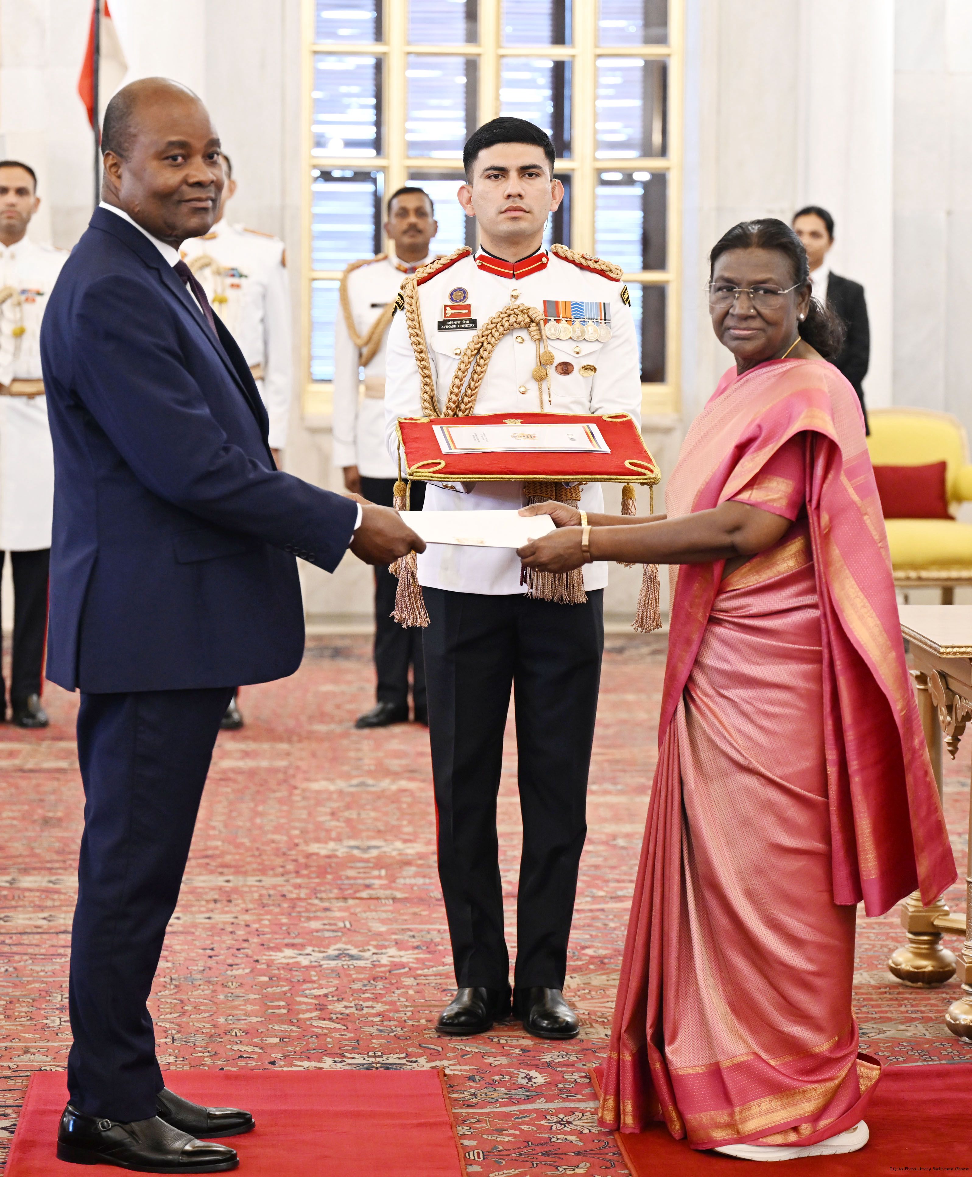 H.E. Mr Erick Jean-Marie Zinsou, Ambassador of the Republic of Benin presenting credentials to the President of India, Smt Droupadi Murmu at a ceremony held at Rashtrapati Bhavan on May 30, 2025.